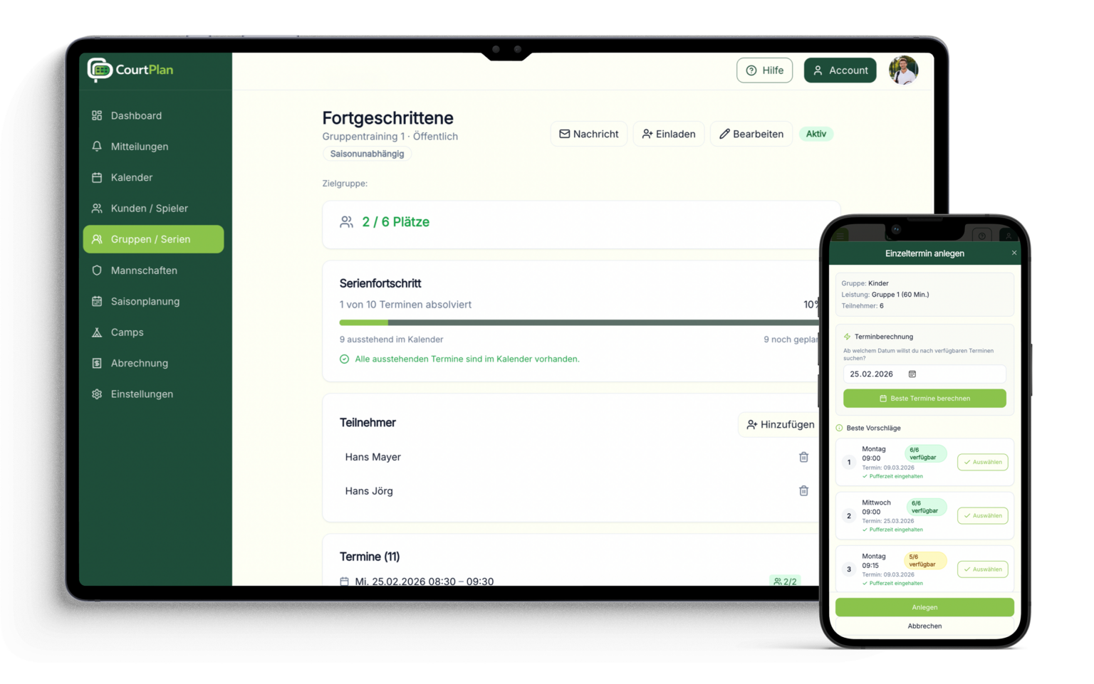 Bei der Planung von Gruppen- oder Mannschaftstrainings berücksichtigt CourtPlan automatisch die Verfügbarkeiten von Trainer und Spielern. Geeignete Zeitslots werden vorgeschlagen, sodass Trainings effizient geplant werden können.