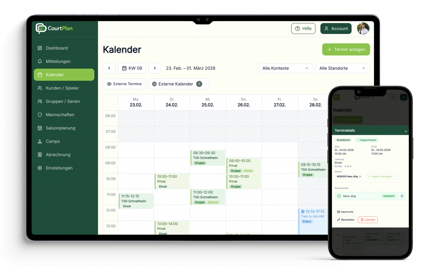 Alle Einzel-, Gruppen- und Mannschaftstermine in einer klaren Tages-, Wochen- oder Monatsansicht. Neue Termine lassen sich direkt im Kalender erstellen, per Drag & Drop verschieben und in den Details vollständig bearbeiten.