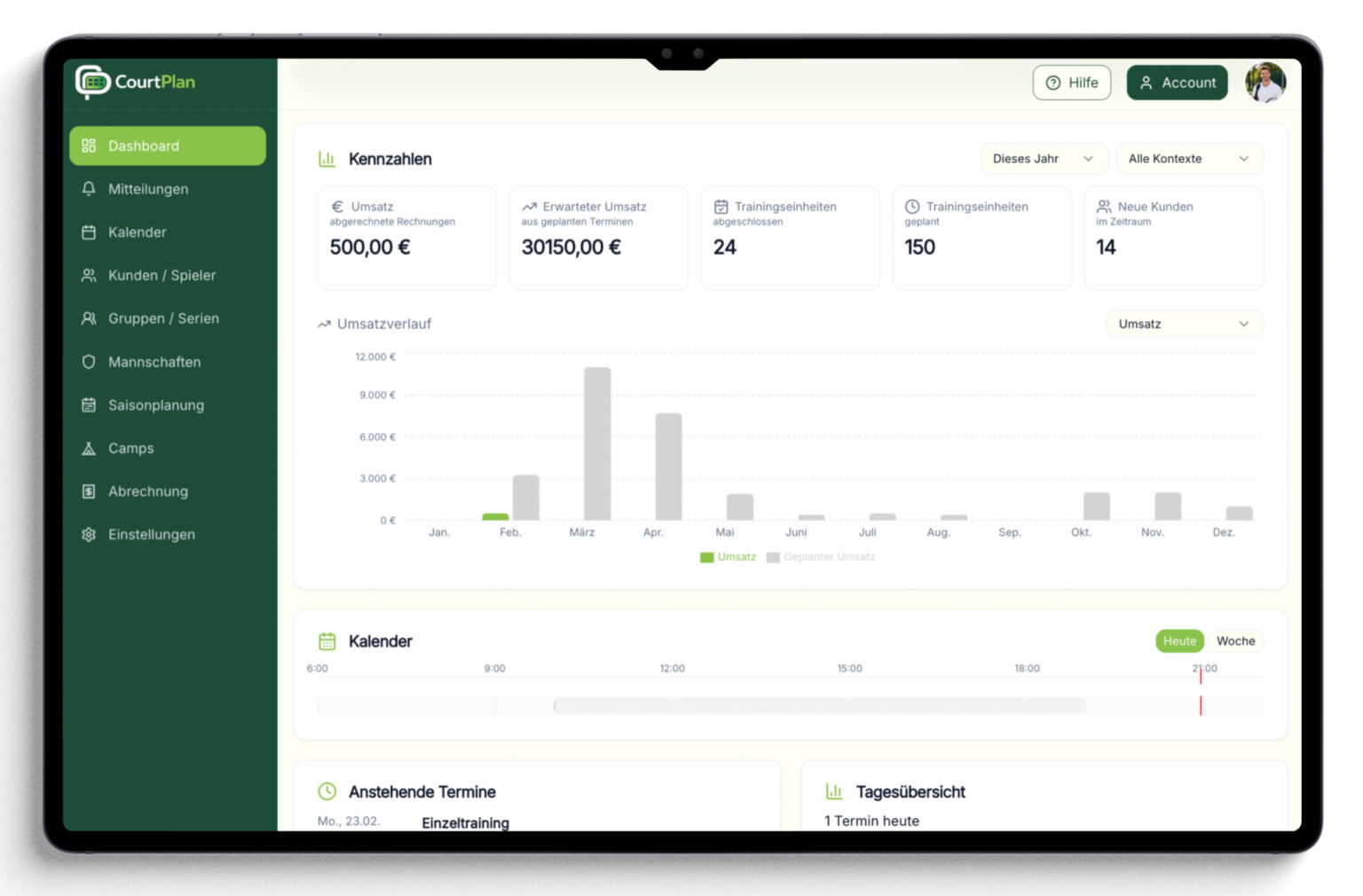 Lege deine Trainerverfügbarkeiten, Trainingsorte, Kontexte (z. B. Vereine) sowie deine Trainingsleistungen fest. Auf dieser Grundlage erstellt CourtPlan anschließend automatisch Termine, Gruppen und Abrechnungen.