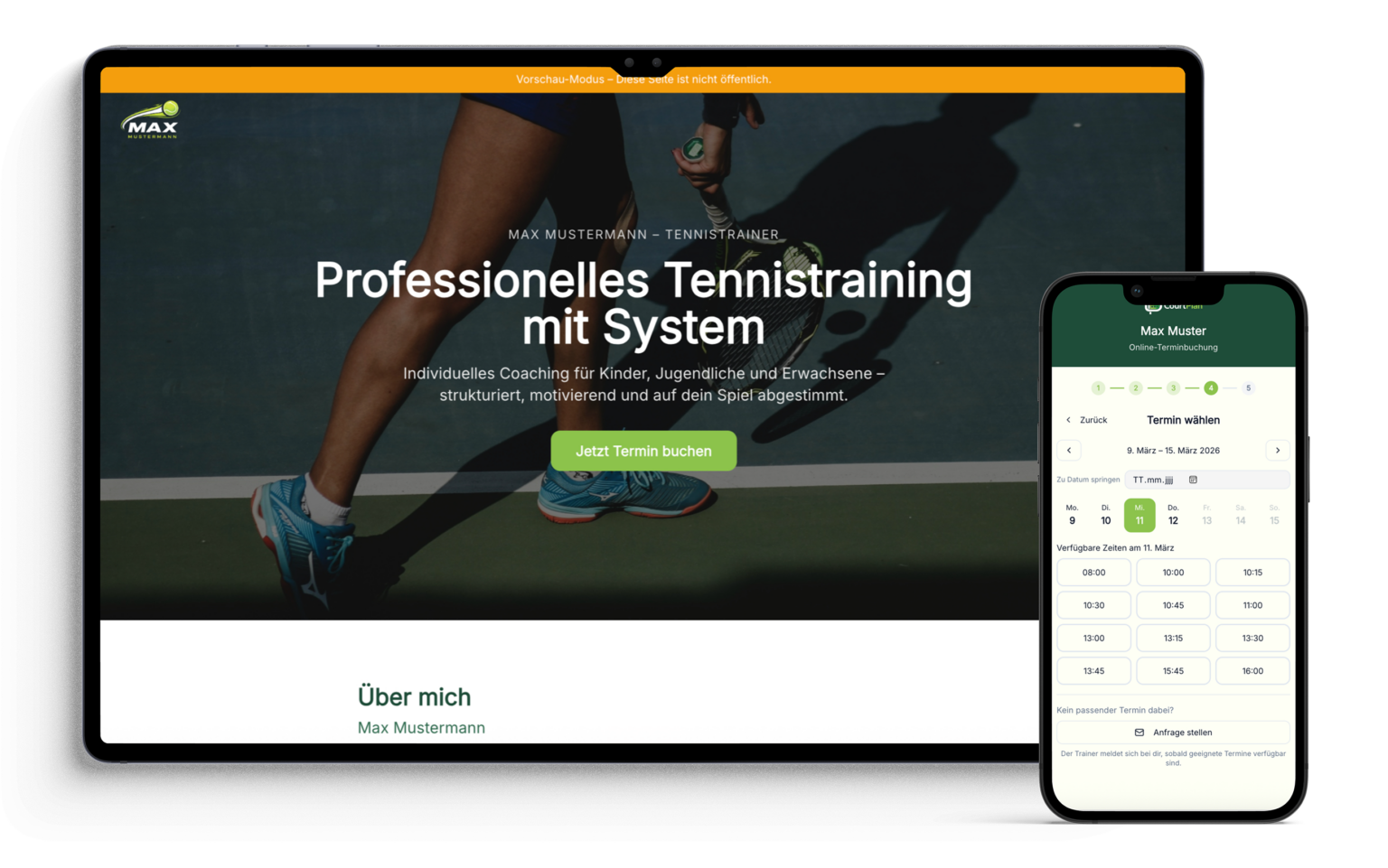 Mit CourtPlan erhält jeder Trainer eine eigene Website mit klarer Struktur und vorbereiteten Inhalten. Texte, Bilder und Informationen können jederzeit individuell angepasst werden – einfach Bild hochladen, Inhalte bearbeiten und fertig ist die eigene Website.