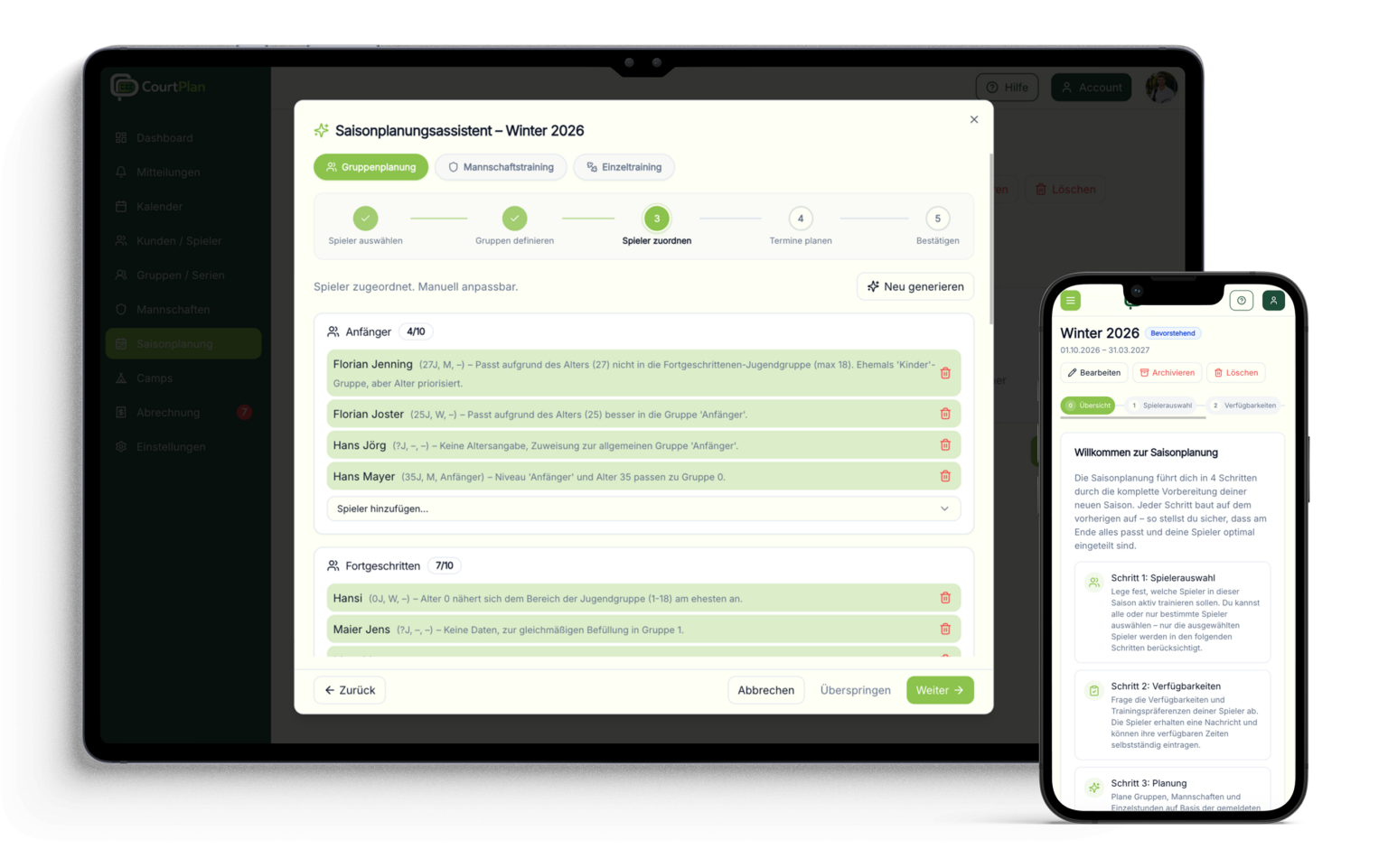 Spieler auswählen, Verfügbarkeiten und Präferenzen einholen, Gruppen erstellen lassen und die Saison vorbereiten.
