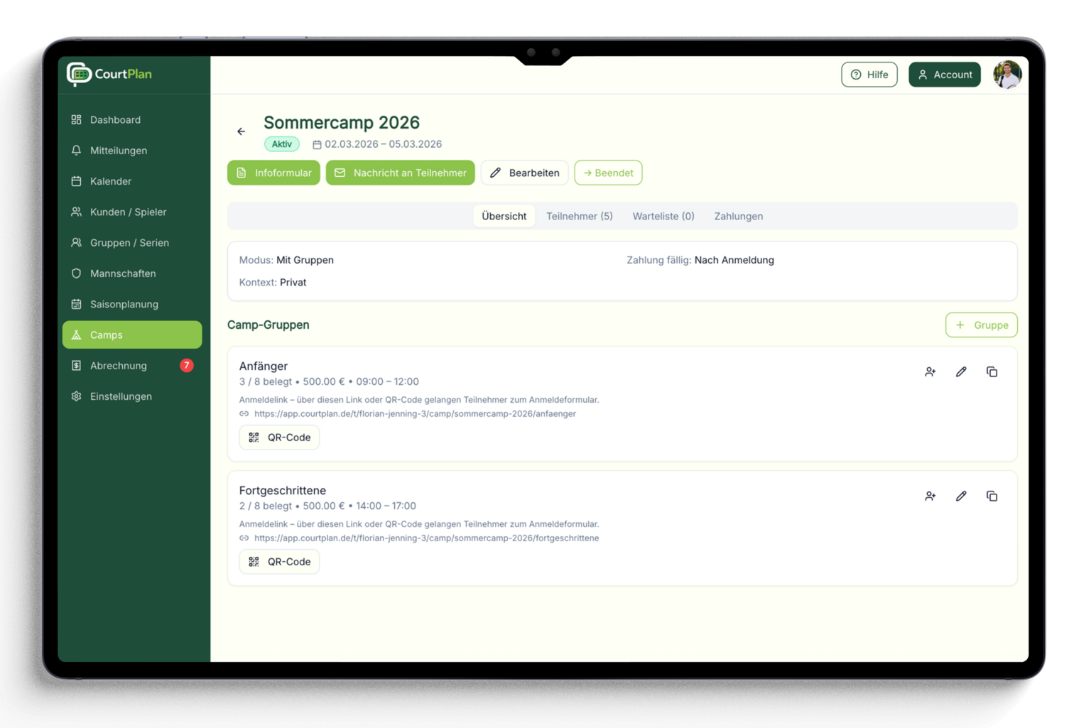 Für jedes Camp oder jede Campgruppe wird ein eigener Anmeldelink erstellt. Teilnehmer können sich unkompliziert über einen Link oder QR-Code registrieren.