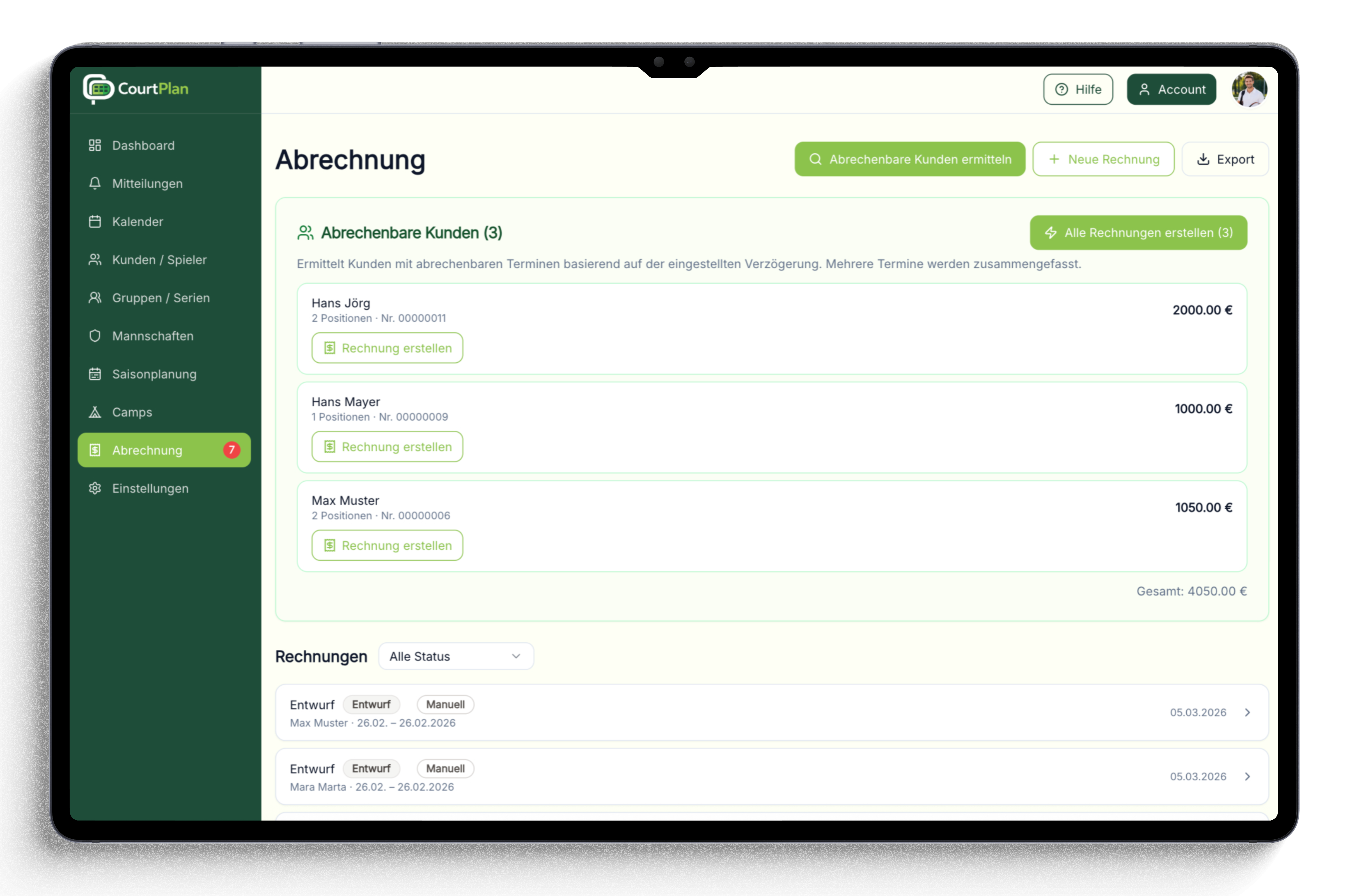 Rechnungen werden manuell oder automatisch aus durchgeführten Trainings generiert – egal ob Einzelstunden, Gruppentrainings oder Mannschaftstraining. Das Abrechnungsmodell wird einmal in der Leistung definiert und anschließend automatisch angewendet.